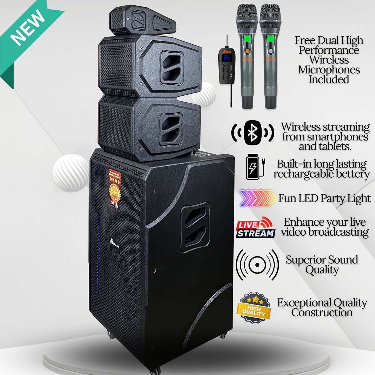 - Comes with two handheld microphones for interactive events (karaoke, public speaking, performances).